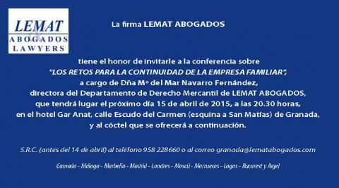 La firma Lemat Abogados organiza el próximo miércoles día 15 de abril una conferencia sobre "Los retos para la continuidad de la empresa familiar", a cargo de María del Mar Navarro Fernández, directora del departamento de Derecho Mercantil del despacho.